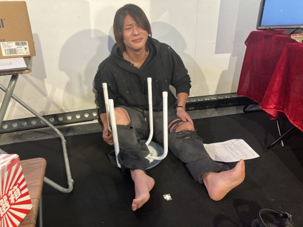 今日の格付けチェック企画で、二流男優まで落ちた東雲怜弥ですが、椅子の背もたれが無くなったことをすっかり忘れて、配信が終了した瞬間に後ろにひっくり返りました。