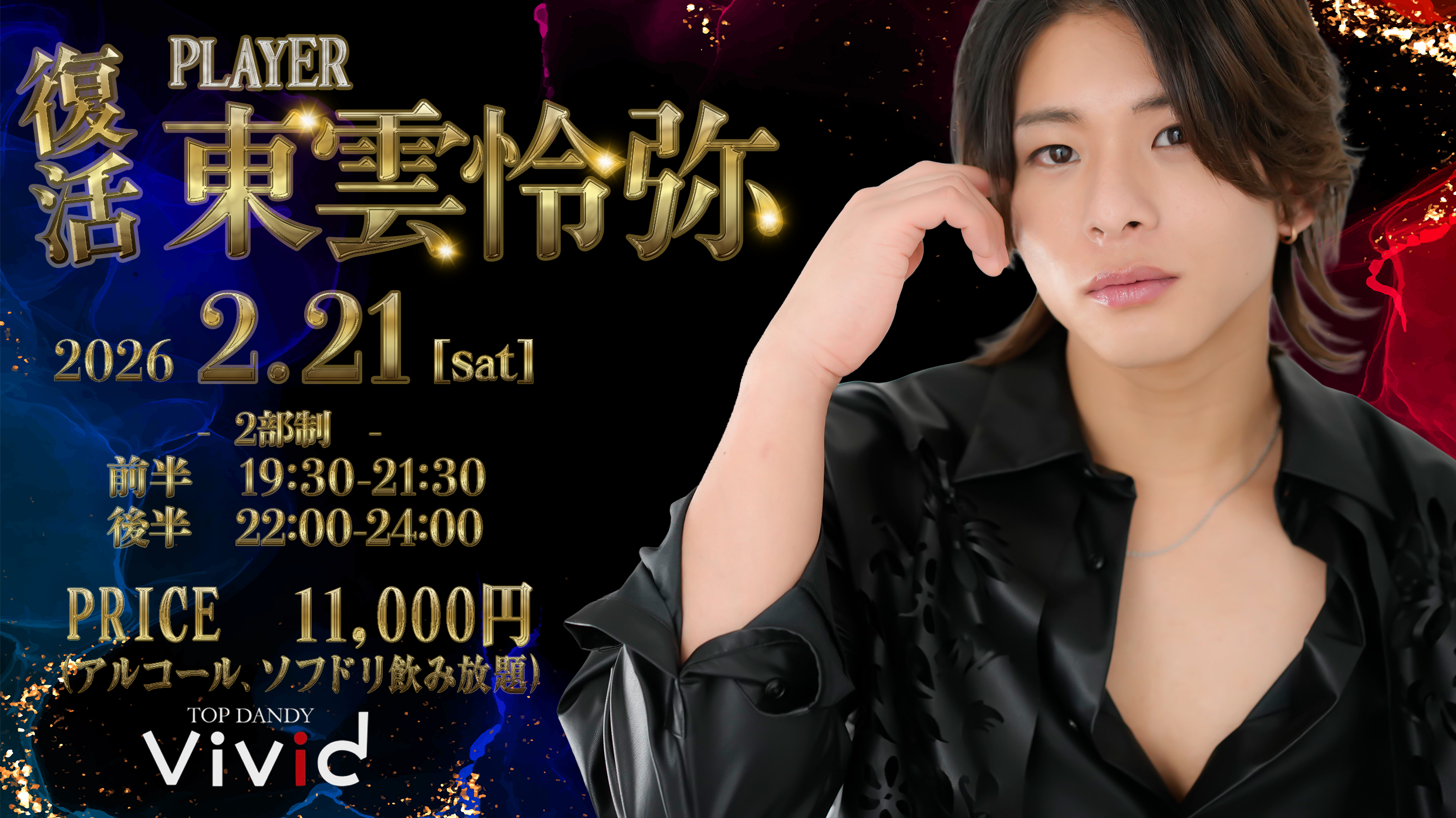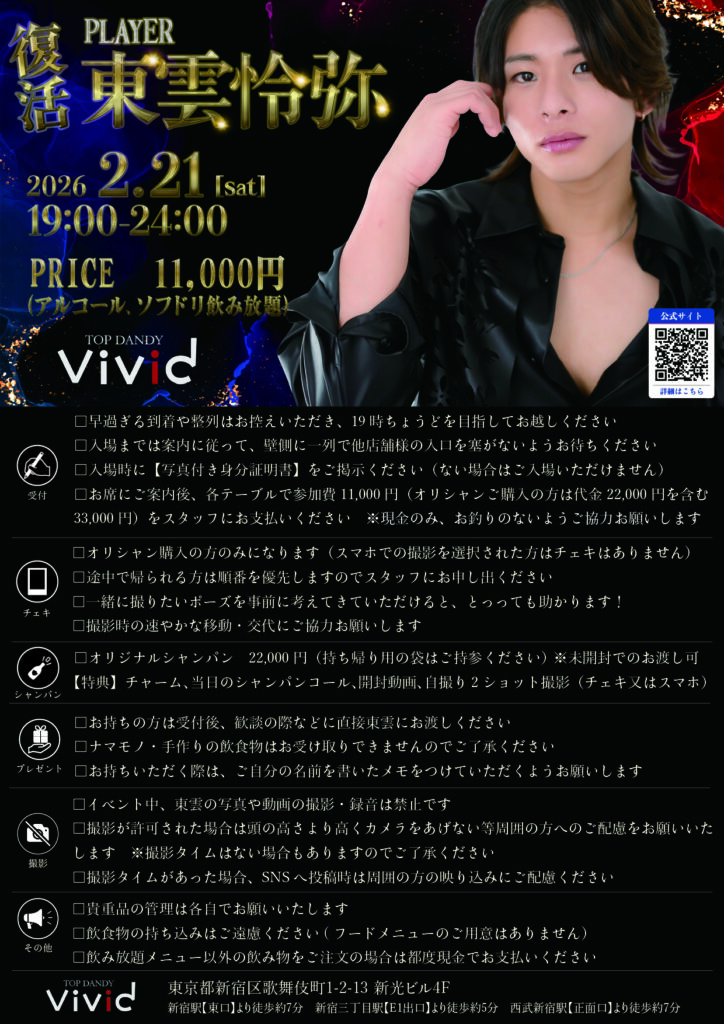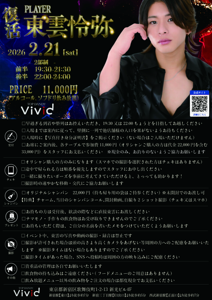 2/21(土)19:00〜24:00 ホストクラブイベント 〜東雲怜弥、ホストに戻るってよ〜 申込期限:1/9(金)15:00✅ 申込フォームはこちら👇